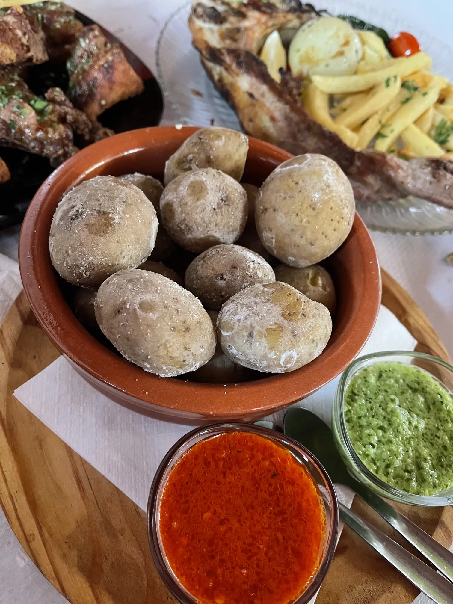 Kalarestoranides saate ise kalale lisaks suurtest vitriinidest mereande juurde valida, enamasti grillitult – krevette, kalmaare, rannakarpe, kaheksajalgu jm. Krevette serveeritakse ka omaette eelroana, kuumutatuna oliiviõlis koos hulga küüslaugu ja tshillipipraga.