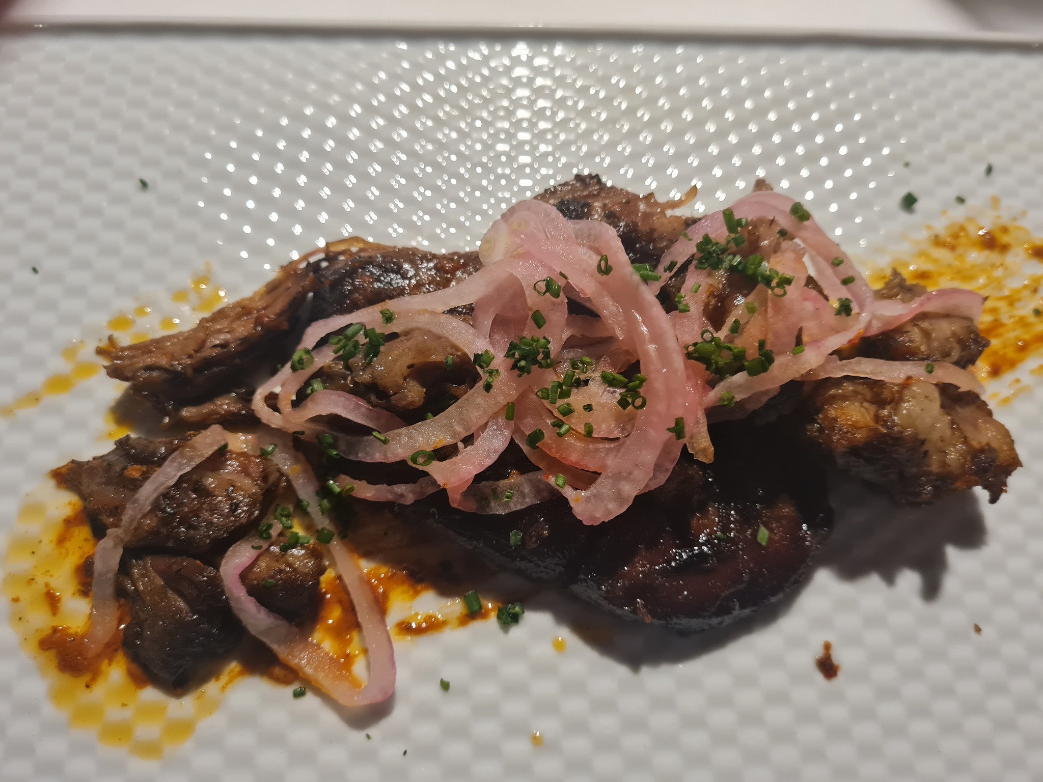 7. Grillitud kits koriandri, punase sibula ja tšilliga – 20 €. Kohalik eripära, väga paras ja nauditav ports.