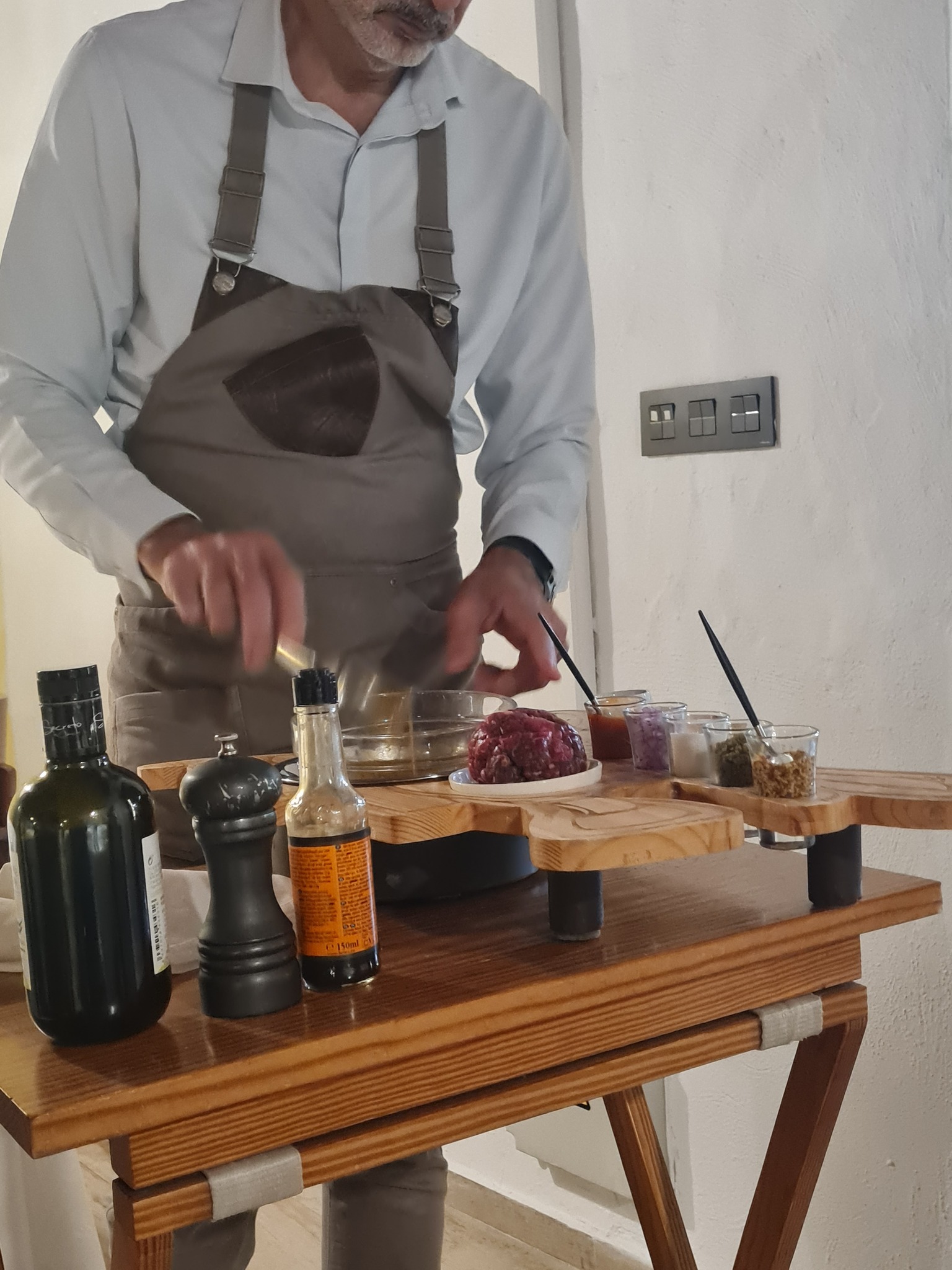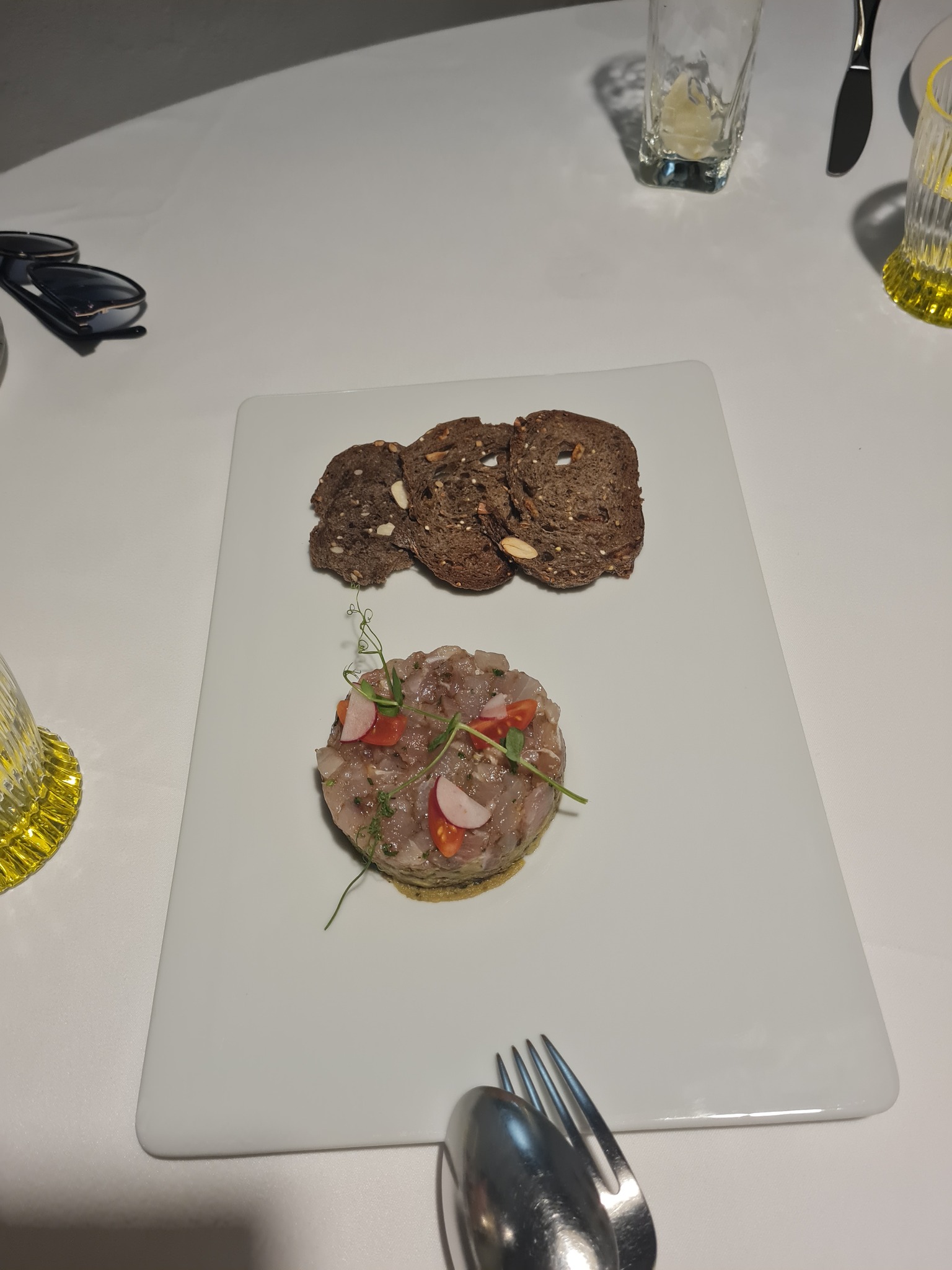 1. BATTUTA DELLA FATTORIA – wagyu tartar, mahemuna, mandlimajonees, balsamico ja kurgivaht, 34,50 €. Jagus kahele, segati abilaual, koostisosi kokku kaheksa. Andis enne serveerimist ka vürtsisust maitsta. Maitse oli pisut soolane, kuid tagasihoidliku eestlasena olin rahul ja arvasin, et pole hullu, soola ju sellest toidust maha võtta ei saa… Kui aga sööma hakkasin, siis isegi mulle, kes ma soolast armastan, oli see liig. Hea liha maitset polnud tunda, vaid sool. Pettumus.