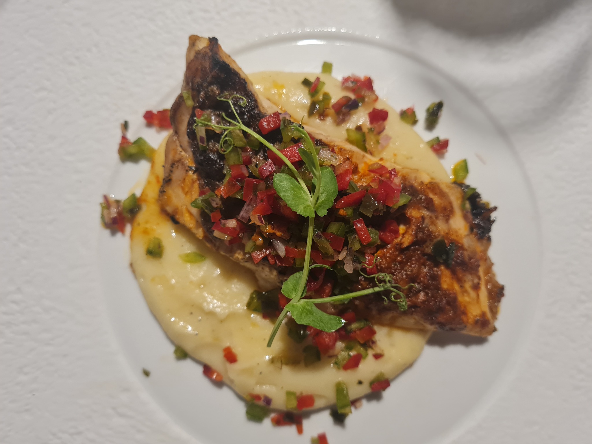 6. Värske röstitud kala, mere chimichurri – 26 €. Pompano kartulipüreega, maitsev, kuid kala veidi kuiv.
