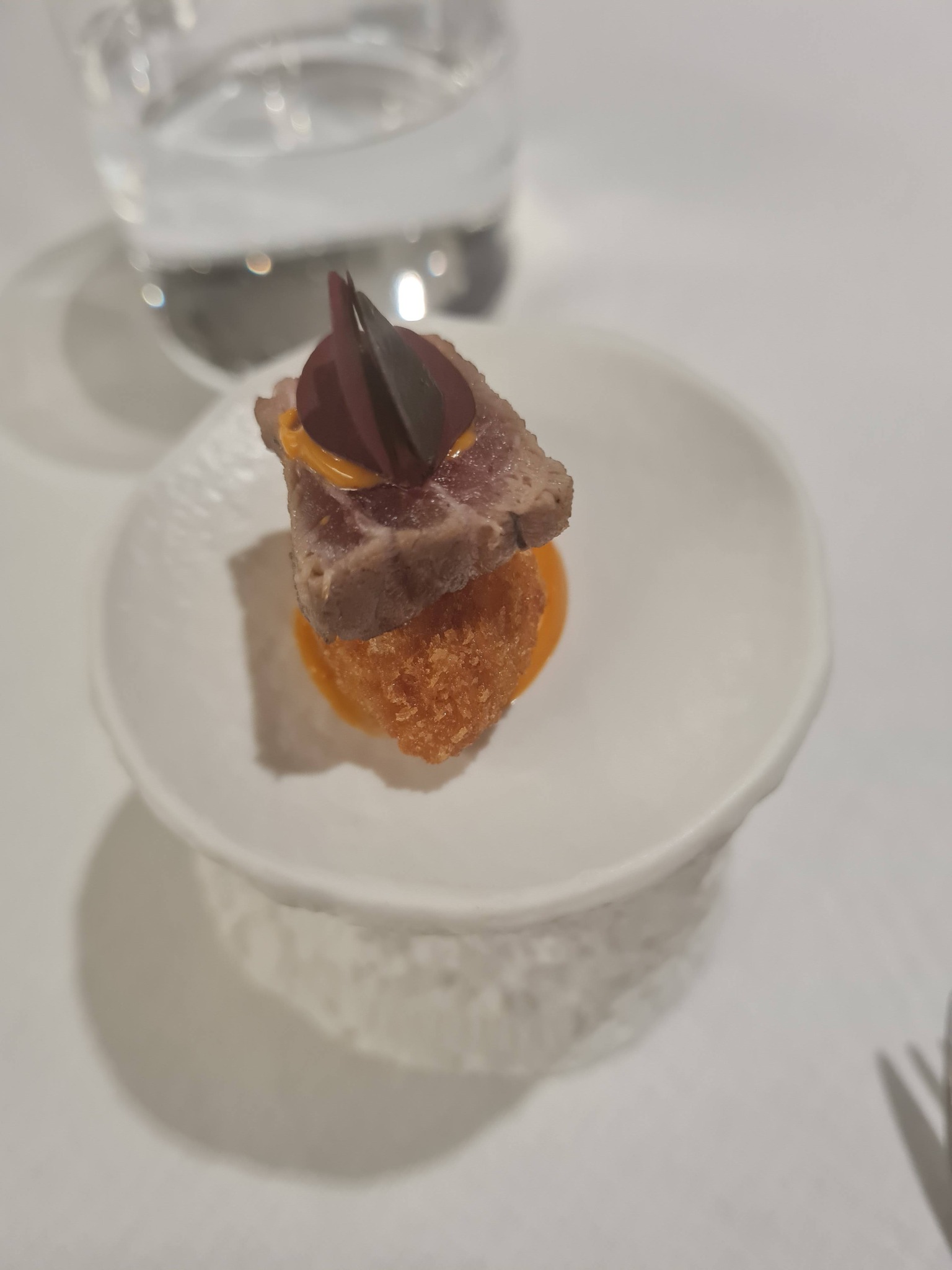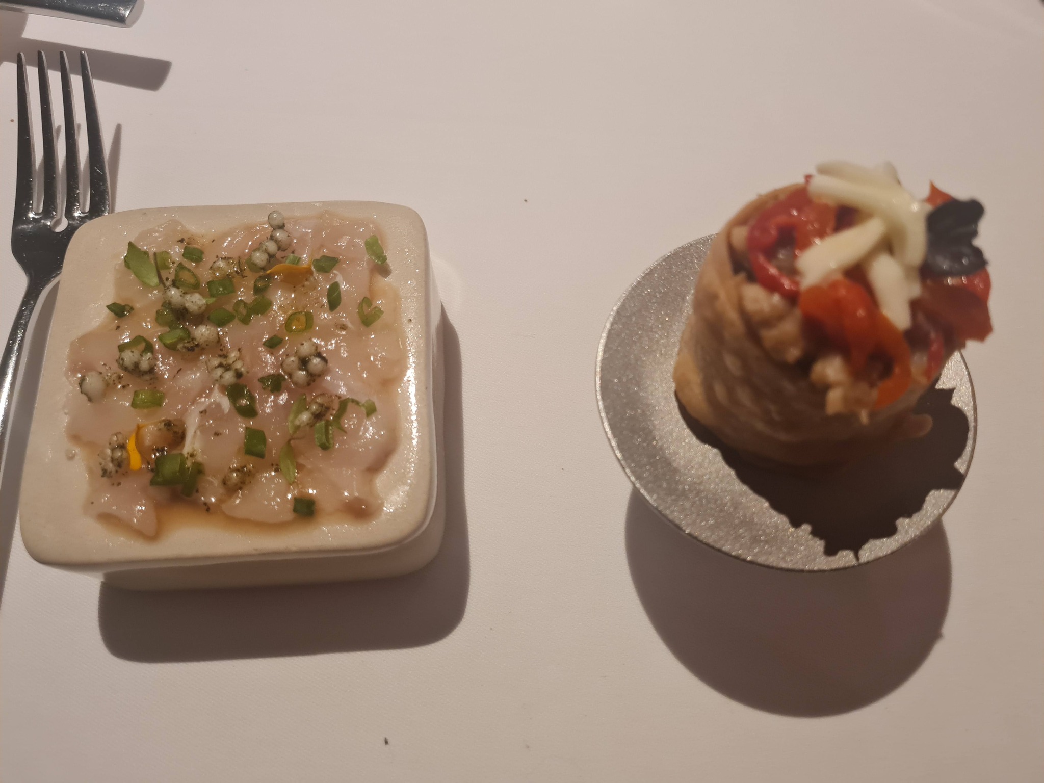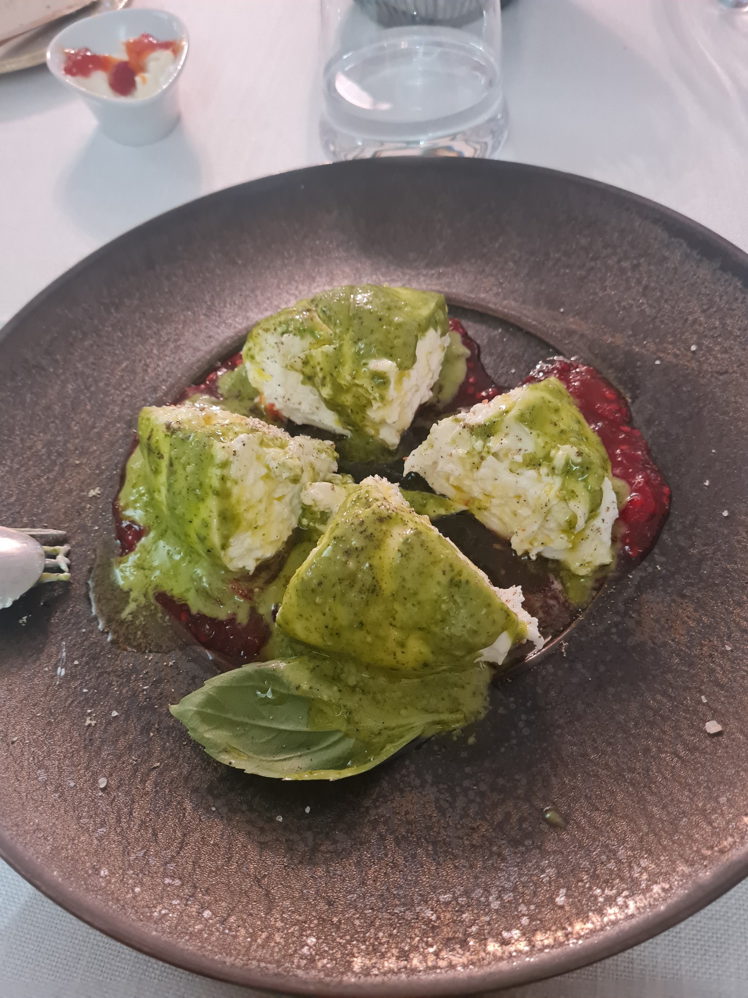 1. Krõbedad musta põrsa ravioolid vürtsika stracciatella (Apuulia piirkonnast pärit pehme juust) ja marineeritud paprikaga. No näed – ka ravioolisid saab teha krõbeda lehtaignaga. Head.
