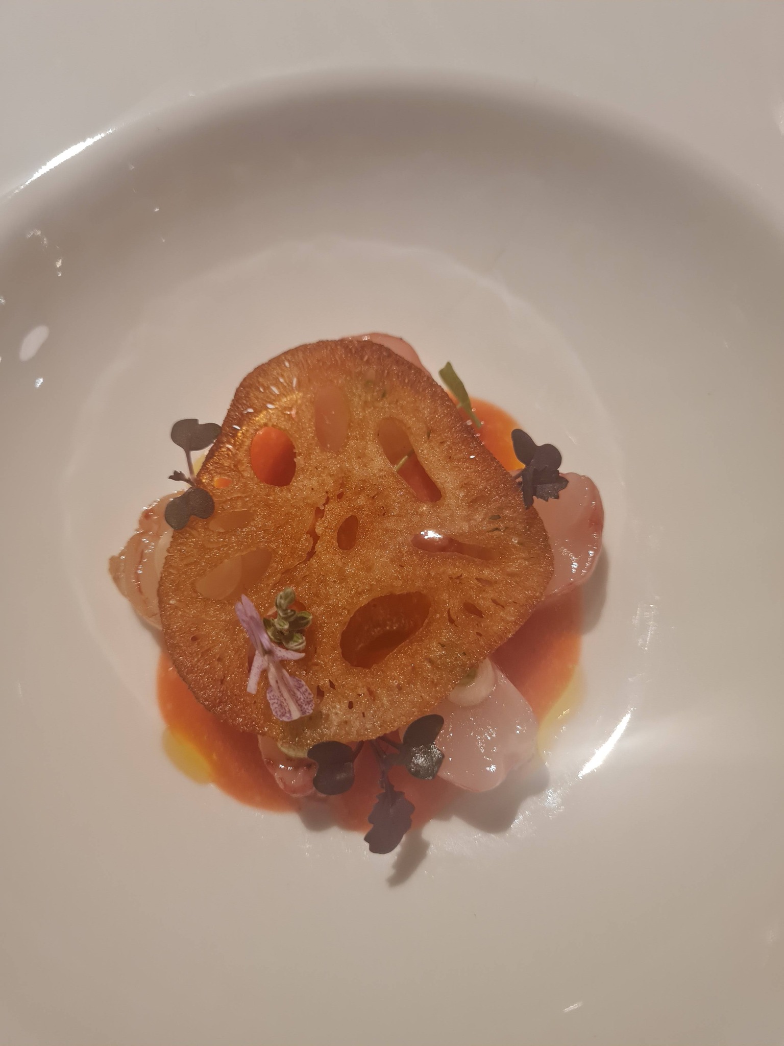 4. Grillitud karabinerod (punakaspruun krevett) maasika-tšillivees, lootosejuure ja rocoto-pipraga. Serveeritud portselantaldrikul. Minu maitsmist mööda toored krevetid, väga hästi marineerunud, lootost polnud ammu söönud, lausa võttis mõmisema – ülihea, maitseelamus.