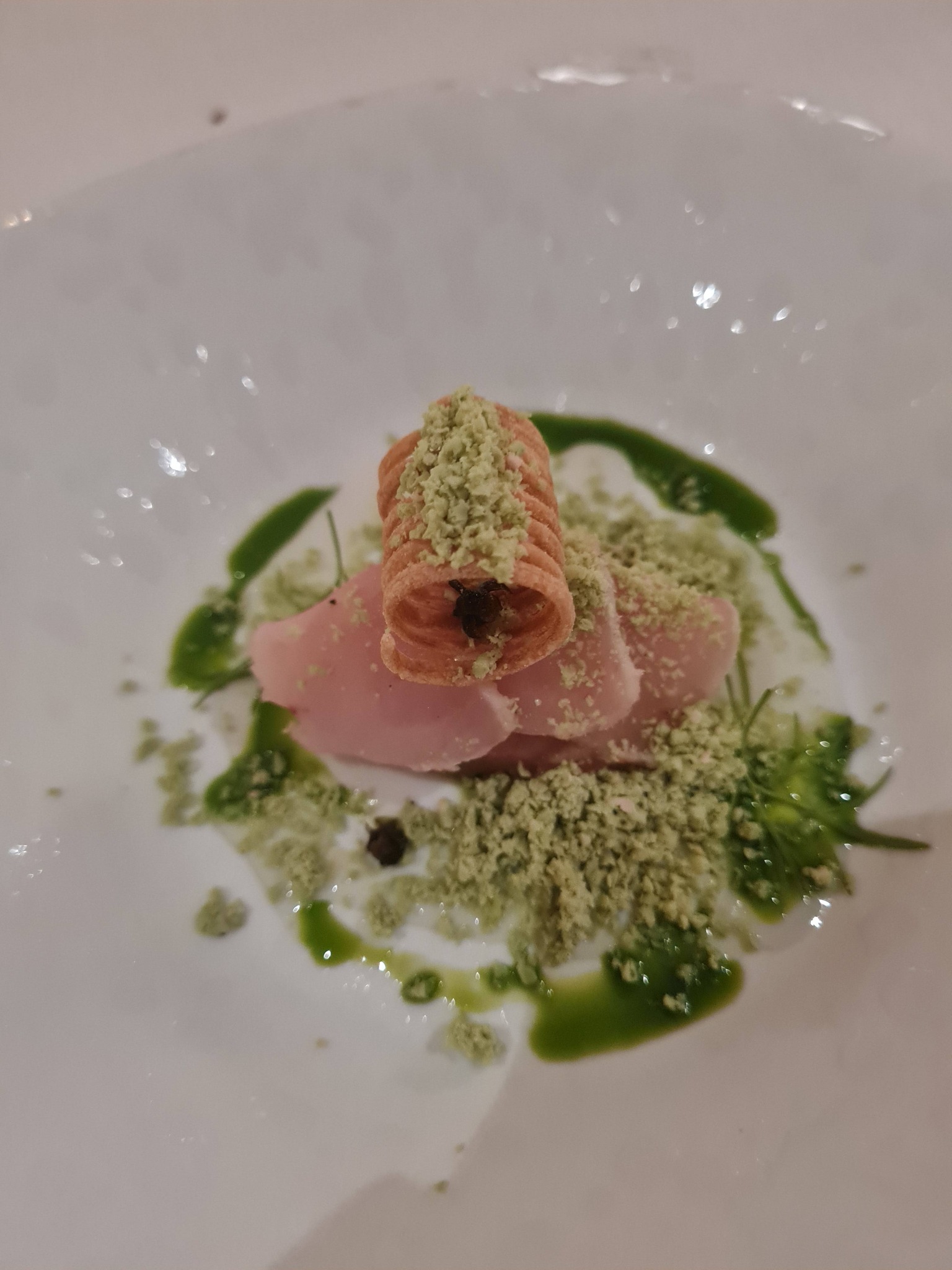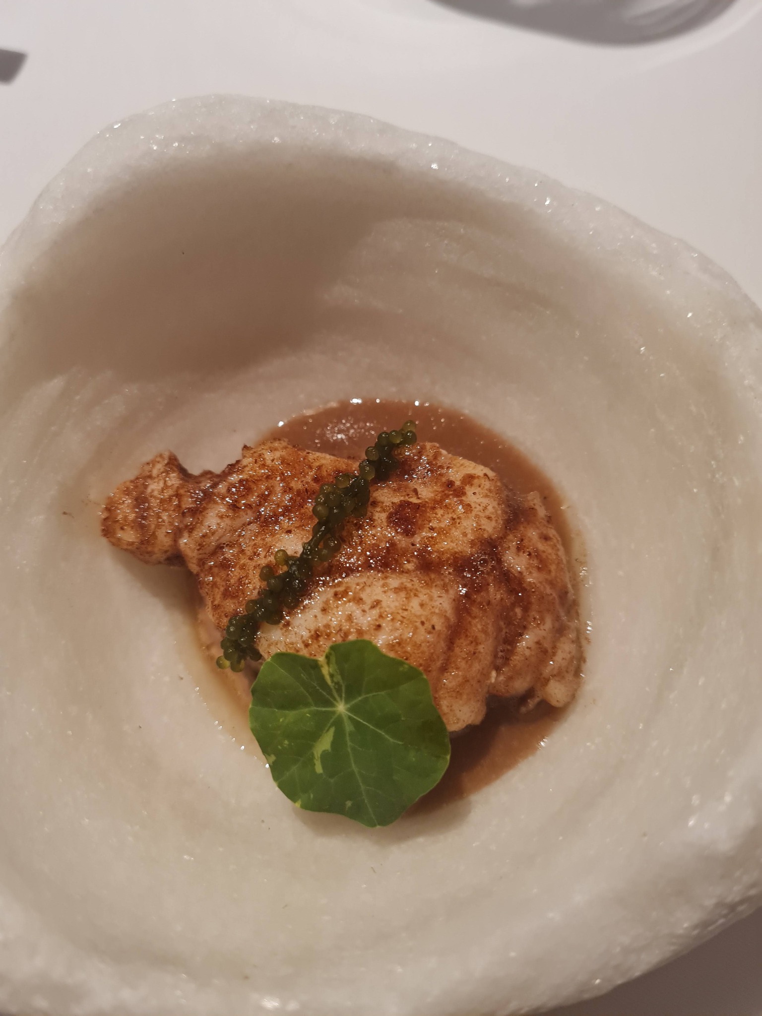2. Meriahven usuzukuri ponzu (jaapani kaste) ja krõbeda basiilikuga. Hea tekstuur, paras sool, basiilikut ei tuvastanud – väga hea.