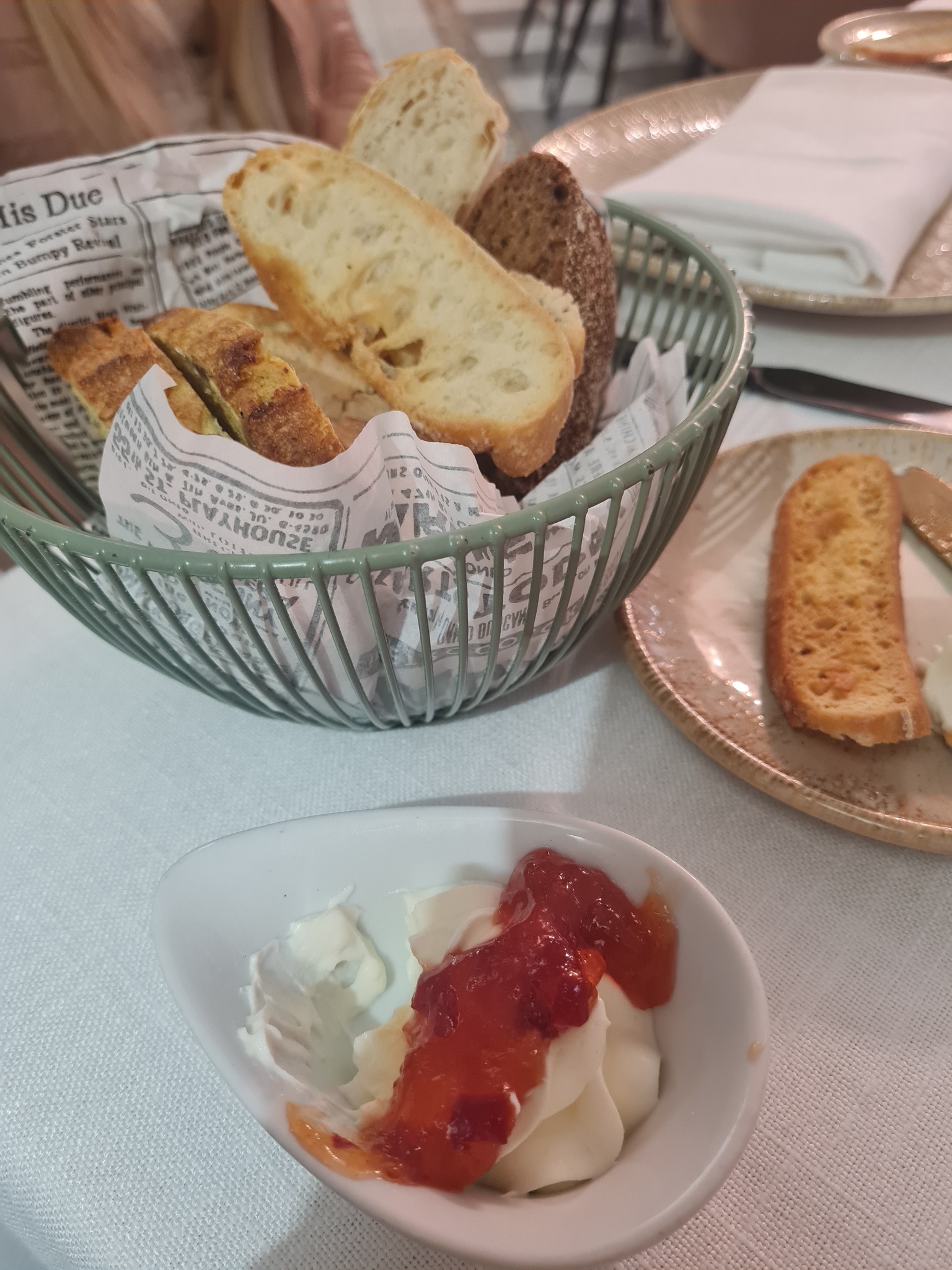 1. Haputaignaleivad ja vahustatud toorjuust magusa tšillikastmega – 2,90 € p/p. Omavalmistatud saiad, huvitav ja õnnestunud maitsekombinatsioon.