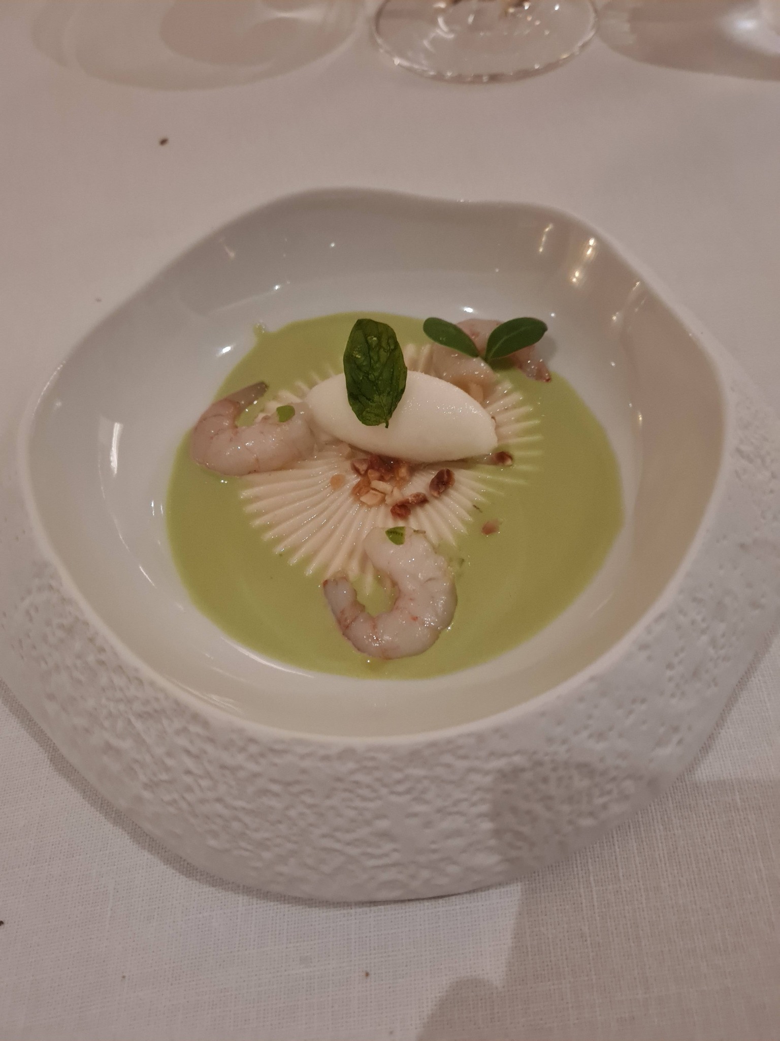 2. Sõdurkrevetid El Hierrost kreemjal mandlil, rohelisel gazpachol ja shiso sorbetil. Huvitav temperatuurimäng, hästi söödav, kuid ootused jäid kõrgemaks.