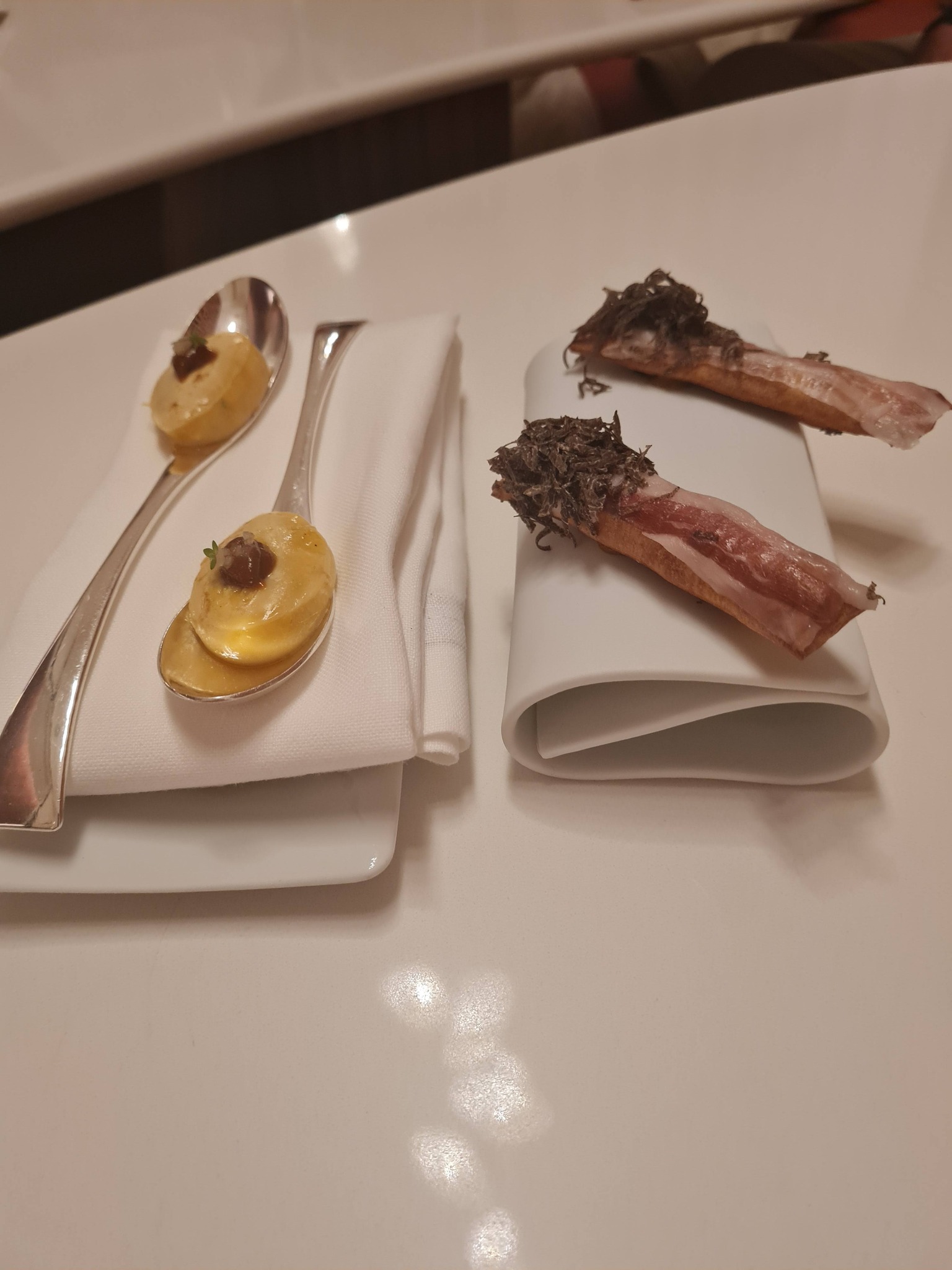 Alguses istutati eessaali, kus pakuti väikeseid ampse: heeringavaht seakrõbinaga (väga hea), foie gras tarretisega (ülihea, maitseelamus), küpsis munakollase kreemiga (hea) ning grissinile mässitud krõbe peekon musta trühvliga (väga hea, maitseelamus).