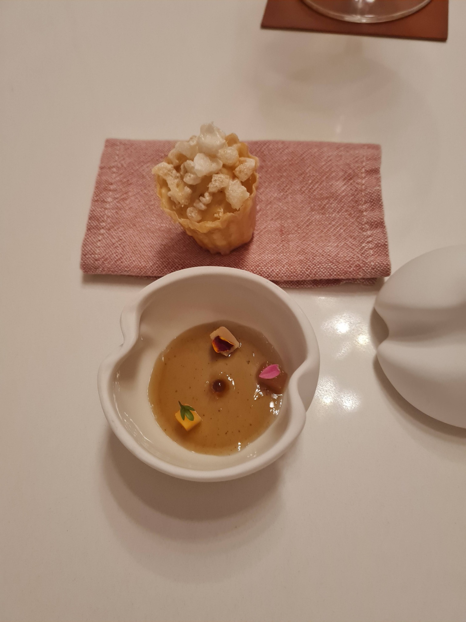 Sai valitud kaheksakäiguline degustatsioonimenüü, 78 EUR, mis peaks kõige paremini iseloomustama koka oskusi. Ja ootan alati mitte kõhutäidet, vaid maitseelamust. Proovisin menüü eesti keelde Google abil tõlkida, mõnda sõna ei tõlkinud.