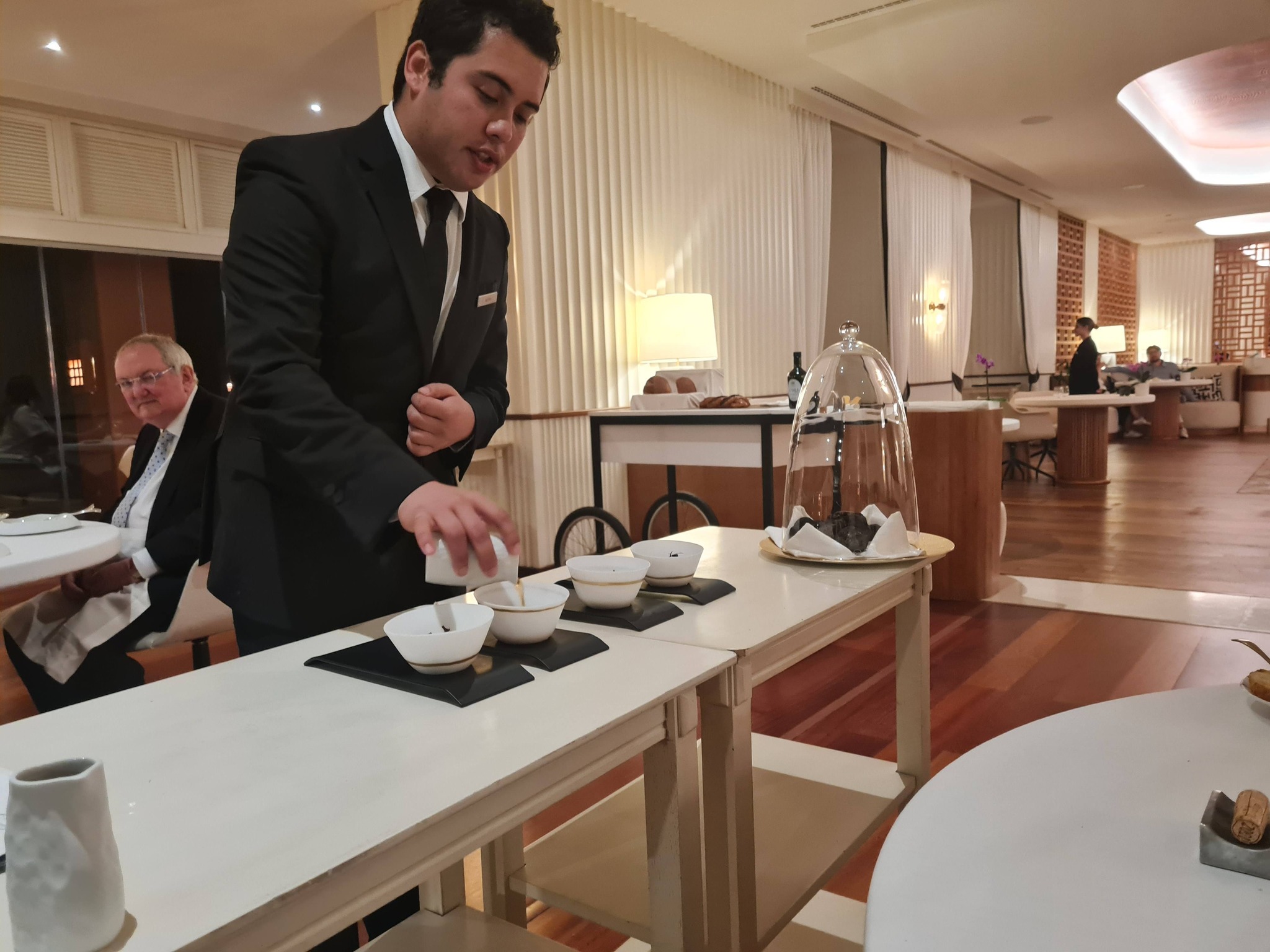 Teenindas kaks kelnerit, serveerisid toite lauale üheaegselt. Veini avas koolerist jää pealt välja võtmata – tase! Üle hulga aja nägin spetsiaalset alust veinikorgi jaoks. Lauda pühiti mitu korda, ka olematutest purudest. Juhatati tualeti ukse juurde ja kui tagasi tulin, ootas tooli taga, et see mulle alla lükata. Lõpus kingiti daamile roos – jällegi tase. Seni külastatud Tenerife ja üldse Michelinidest parim teenindus. Tundsid end oodatuna ja lausa kuningana. Professionaalsest kretinismist avastasin aga ühe apsu: joodud veiniklaasi ei koristata laualt enne, kui on uus vein välja valatud. 20 punkti.